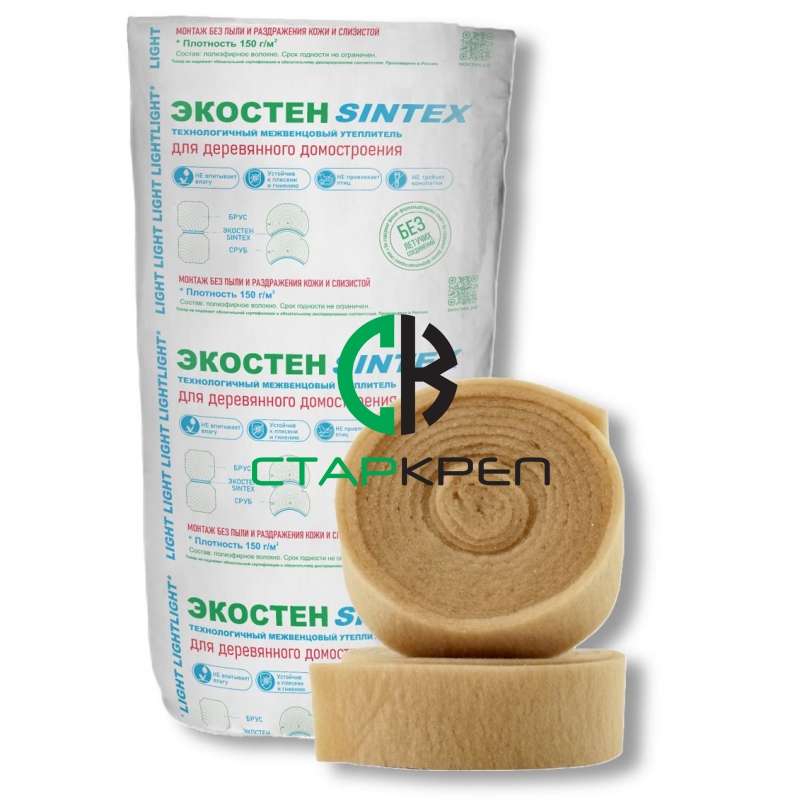 ВАЖНО!!!!!!! «ЭКОСТЕН Sintex» изготавливается из особых полиэфирных волокон с высокой степенью извитости. Благодаря технологии термоскрепления материал отлично восстанавливает форму после сжатия, заполняя все щели при естественной усадке и «дыхании» древесины.